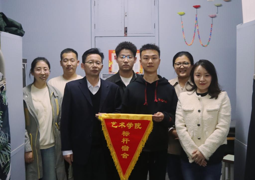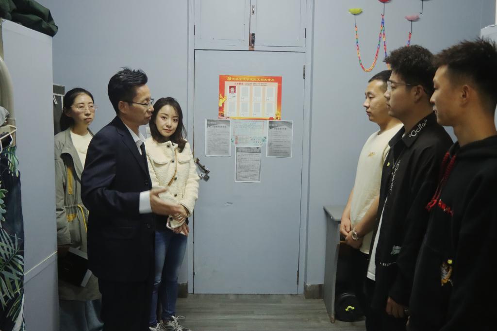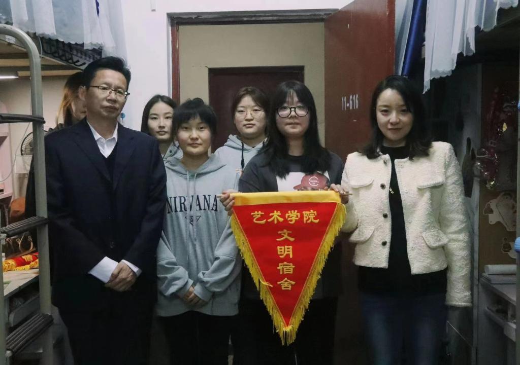 4月27日下午四点,党总支书记刘小龙、副书记钟梅、辅导员刘媛媛、郑娥走访慰问学生公寓,针对三月、四月份公寓卫生检查结果,授予31个“文明宿舍”流动红旗、3个“标杆宿舍”流动红旗。