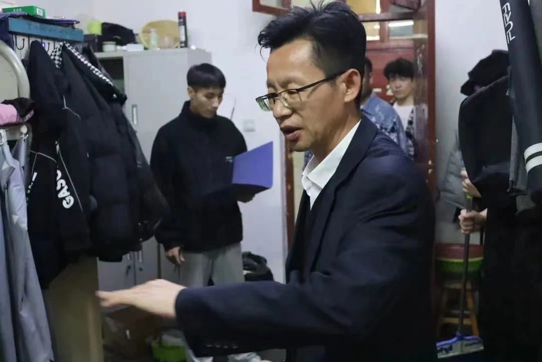 户庭无尘杂,虚室有余闲;宿舍如我家,温暖无限大。宿舍生活是校园生活的核心,是大学生活的重要组成部分之一。为了给同学们营造一个干净、舒适的宿舍环境,引导和培养学生养成良好的卫生习惯和健康的心理品质,4月1日晚上八点,德赢党总支书记刘小龙带领学生会成员对学生公寓七号楼进行了走访检查。