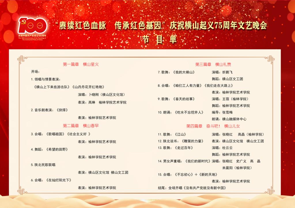整个活动紧紧围绕“赓续红色血脉传承红色基因”这一主题,以歌唱、朗诵、舞蹈、情景剧等为主要形式,分为四个板块,分别为“横山星火”、“横山春早”、“横山礼赞”、“奋斗吧!横山儿女”。