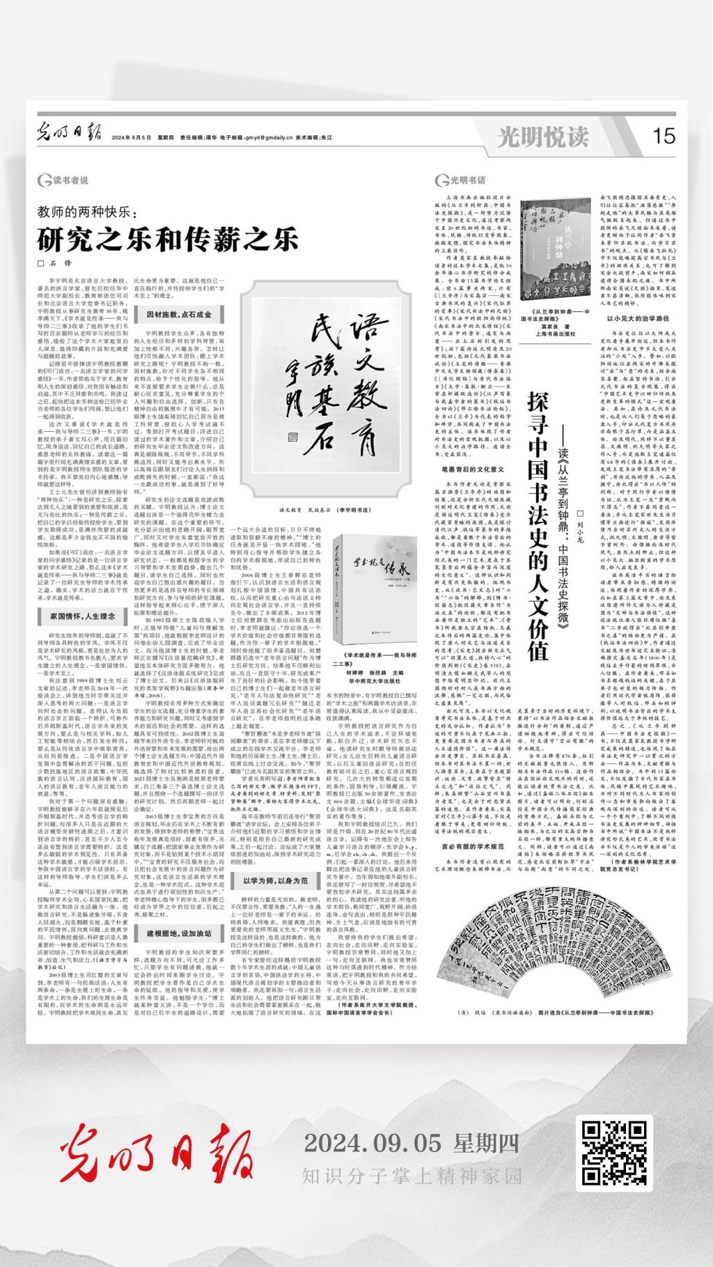 《光明日报》2024年9月5日第15版刊发了德赢党总支书记刘小龙的署名文章:《探寻中国书法史的人文价值——读莫家良〈从兰亭到钟鼎:中国书法史探微〉》。该文主要从笔墨背后的文化意义、言必有据的学术规范、以小见大的治学路径等方面评述了上海书画出版社今年5月份重磅推出的莫家良先生的书法学学术文集。