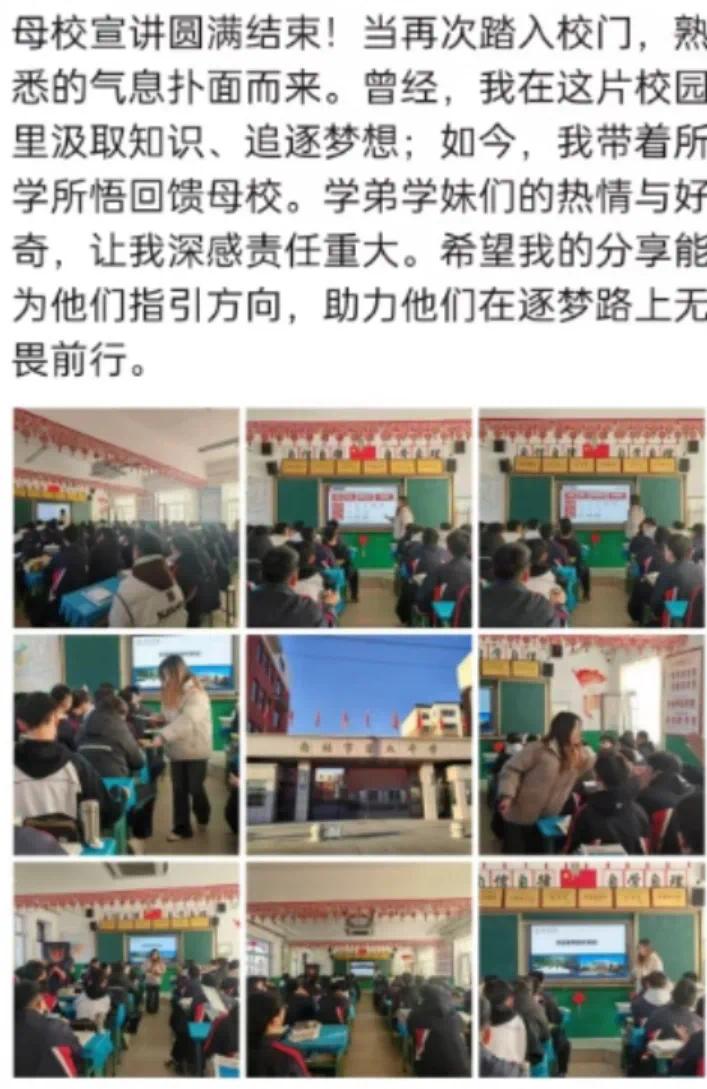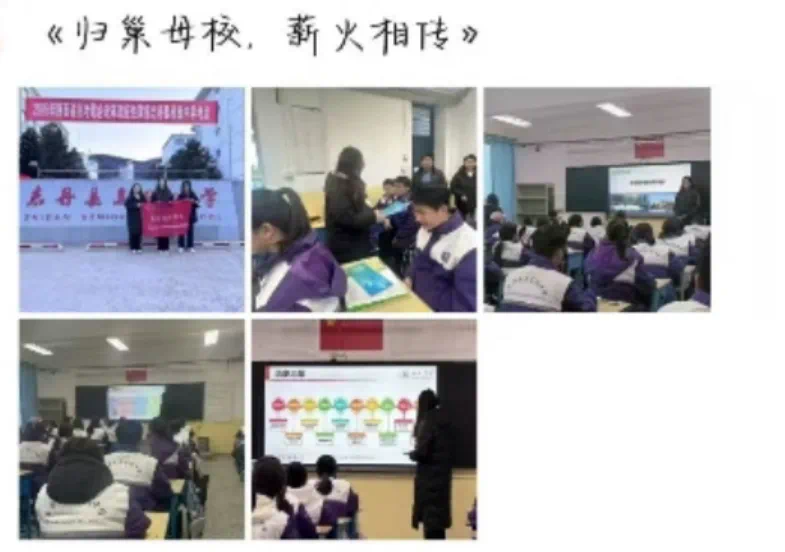 “归巢筑梦青年队”由张咪、徐思思、张凯乐、刘雯静同学组成,于 2025 年1月2日率先在榆林市第九中学开展活动。他们精心策划,不仅深入剖析大学专业领域的知识,还通过展示多彩的校园生活,吸引了学弟学妹们的目光。从德赢vwin体育官网的悠久历史、现代发展,到硕士点建设以及完备的五大功能校园体系,全方位的介绍让母校师生对德赢vwin体育官网有了全新的认识。在热烈的互动环节中,面对学弟学妹们在选专业、招生政策、课程社团等方面的困惑,队员们结合自身经历,耐心解答,助力他们规划未来。这一过程也进一步增强了队员们对学院的归属感与自豪感。