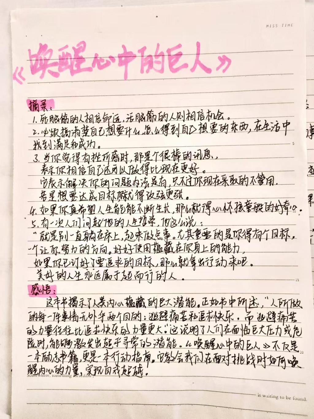 阅读《唤醒心中的巨人》,书中贝多芬等众多名人面对困难时展现出的坚韧不拔精神深深激励着我。每当我遇到挫折时,就会想起他们的故事,不再轻易放弃,而是勇敢地面对,积极寻找解决问题的方法。书中关于自我价值重塑的内容,让我对自己有了更清晰的定位,使我更加自信地面对生活中的各种挑战,相信自己有能力创造属于自己的成功未来。我坚信,这两本书对于每一个寻求自我提升和心理成长的人来说,都是极其宝贵的精神财富。