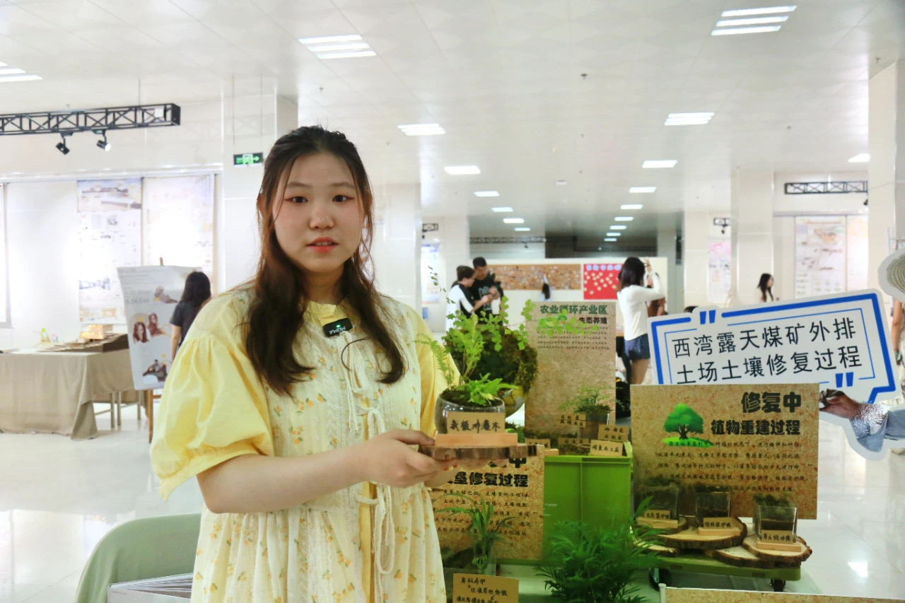 走进展厅,放置在最显眼位置的一抹绿色吸引了许多参观者,这是德赢vwin体育官网2024届环境设计专业毕业生赵钰宁的毕业作品《“农业循环产业园设计”—基于 NBS 理念的榆林市西湾煤矿生态修复计划》,这件作品同样也获得了此次毕业设计的第一名。