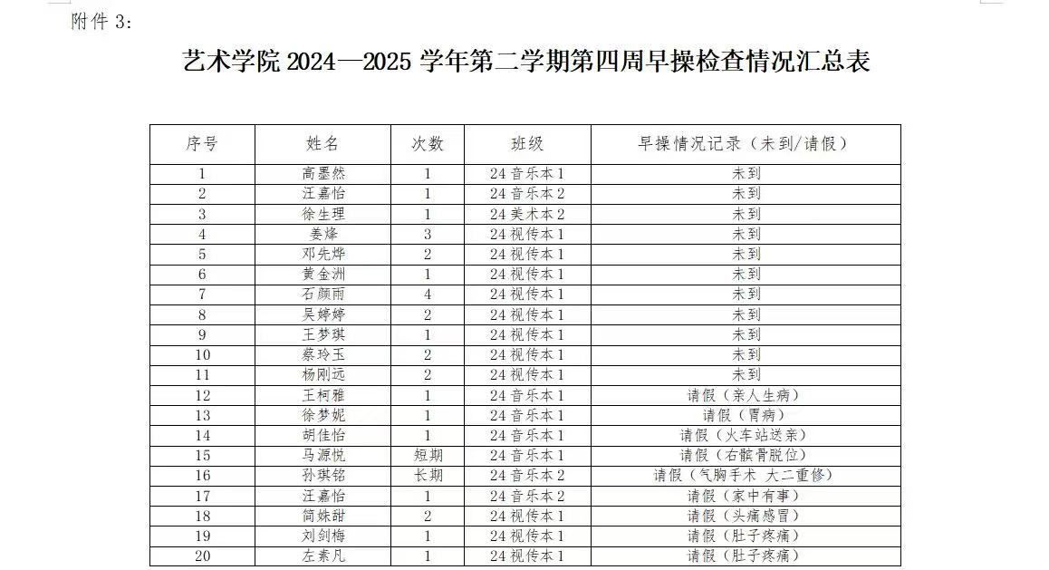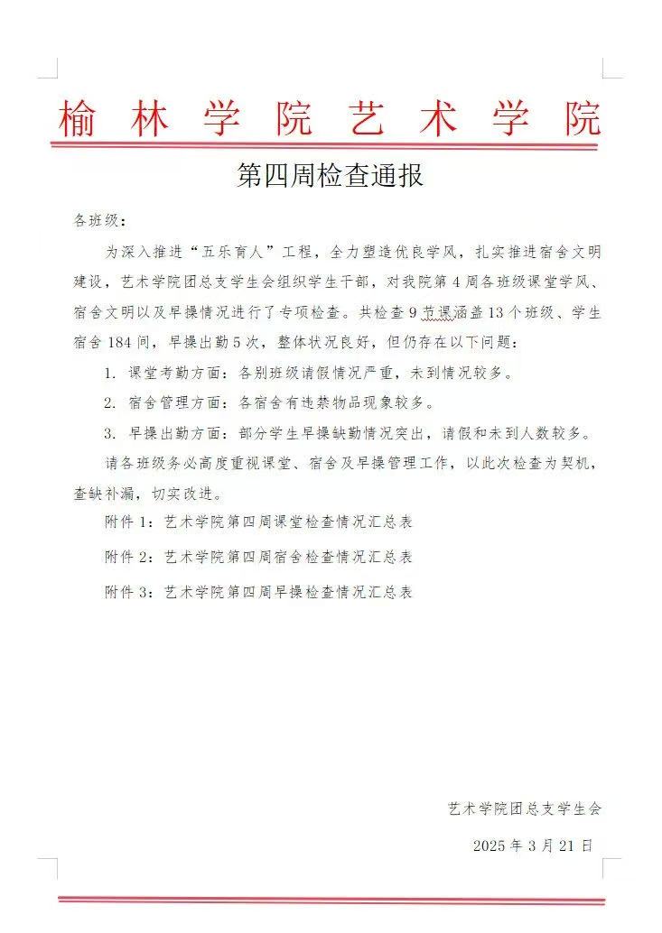 请各班级务必高度重视课堂、宿舍及早操管理工作,以此次检查为契机,查缺补漏,切实改进。