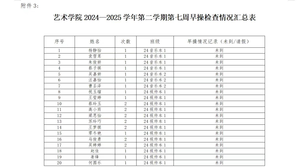3. 早操出勤:大部分同学积极参与早操,精神状态佳;部分班级有早操缺勤问题,请假和未到人数偏多。