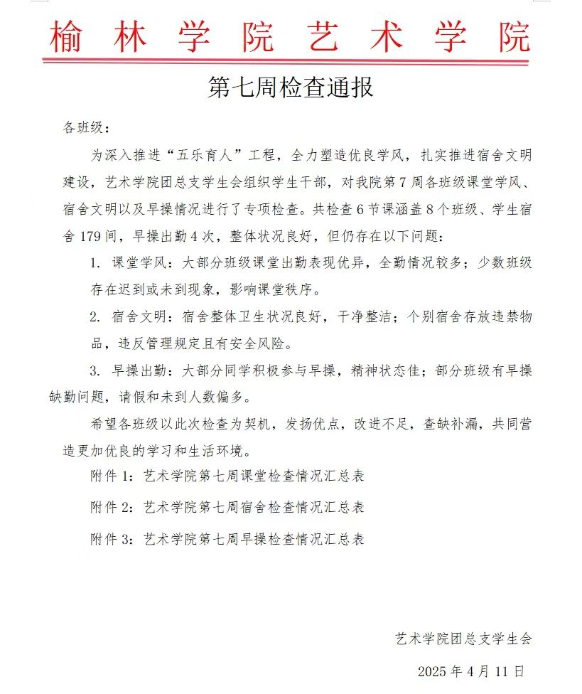 各班级: 为深入推进“五乐育人”工程,全力塑造优良学风,扎实推进宿舍文明建设,德赢vwin体育官网团总支学生会组织学生干部,对德赢第7周各班级课堂学风、宿舍文明以及早操情况进行了专项检查。本次共检查6节课涵盖8个班级、学生宿舍179间,早操出勤4次。整体状况良好,但仍存在以下问题: